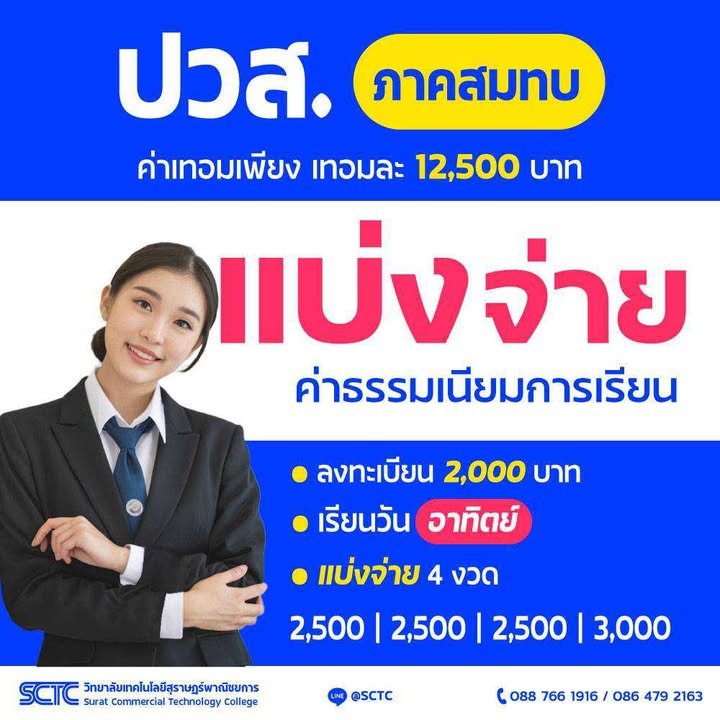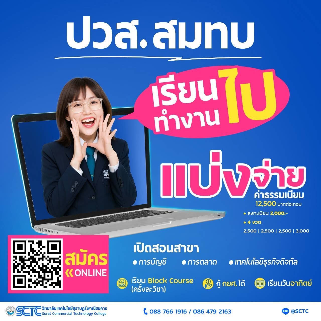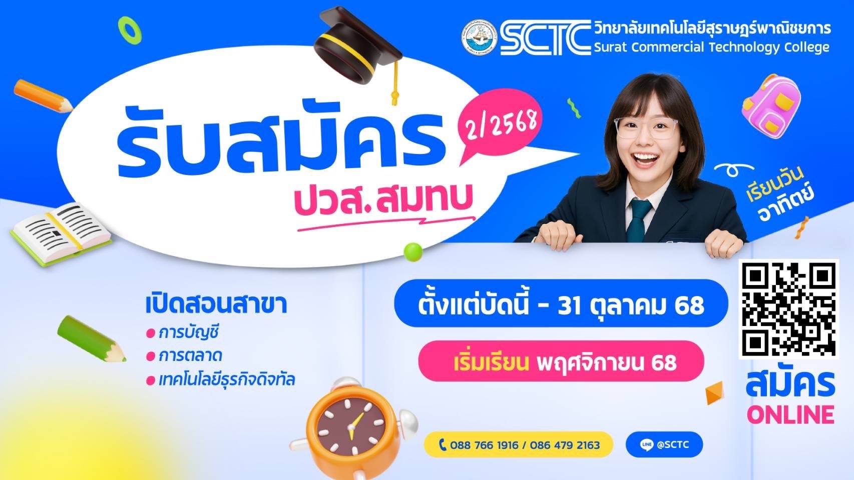 วิทยาลัยเทคโนโลยีสุราษฎร์พาณิชยการ กำลังเปิดรับสมัครนักศึกษา ปวส.สมทบ 2/2568