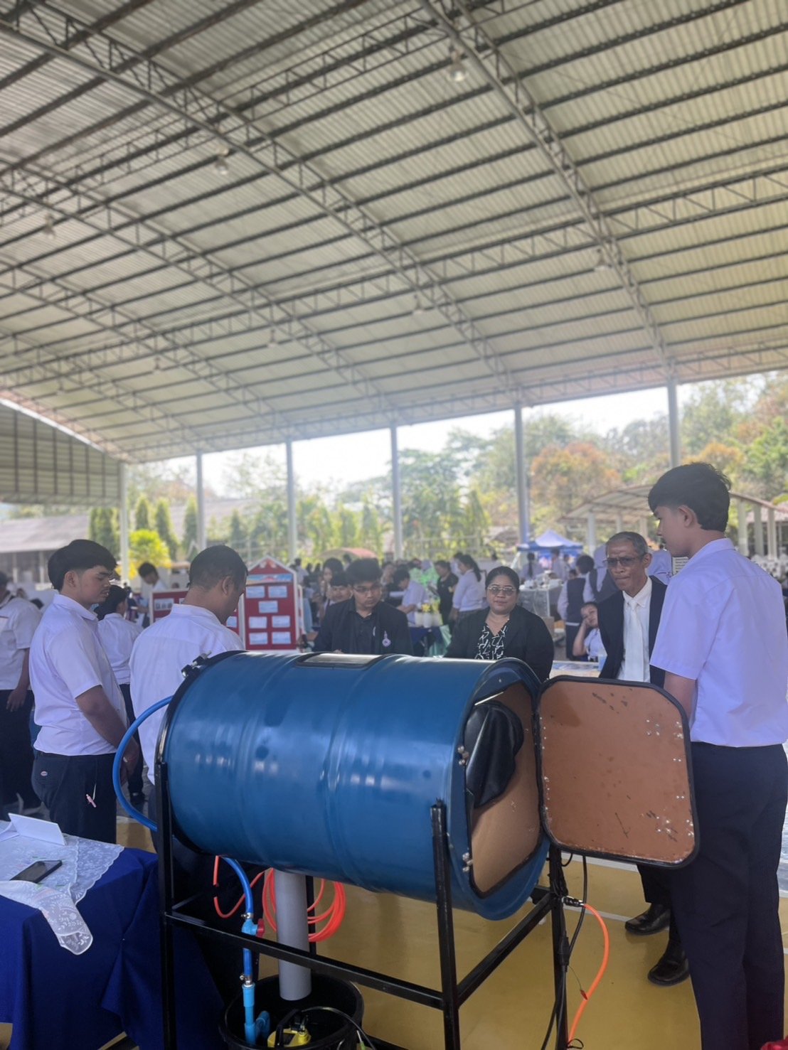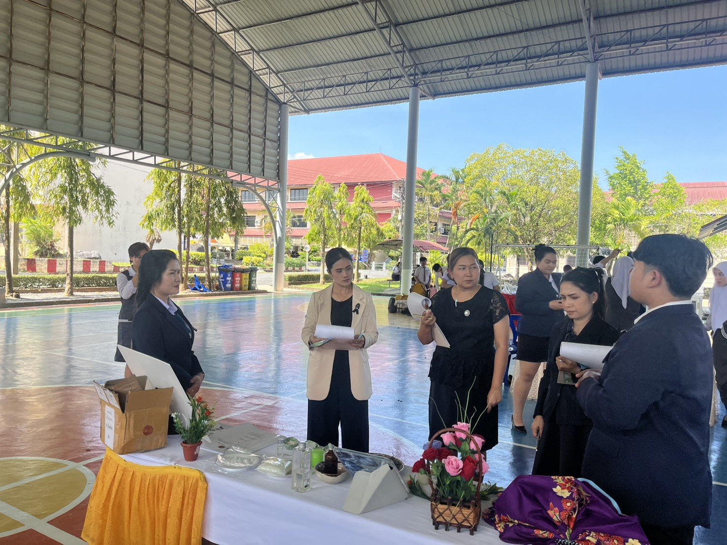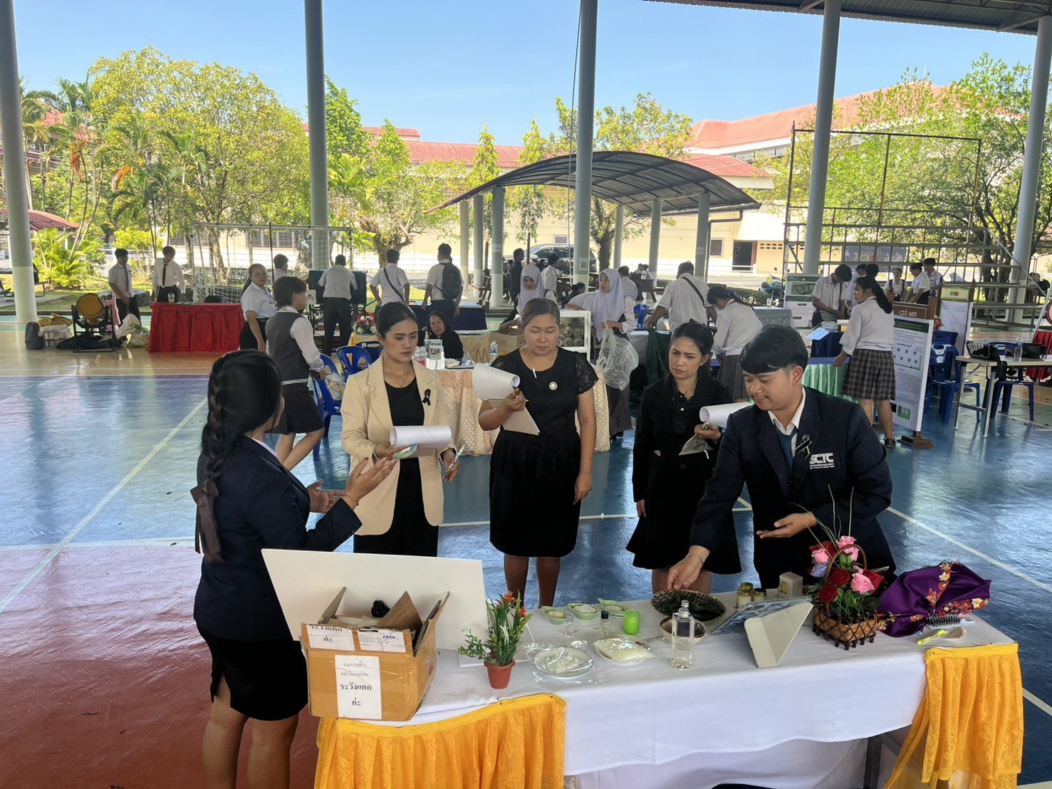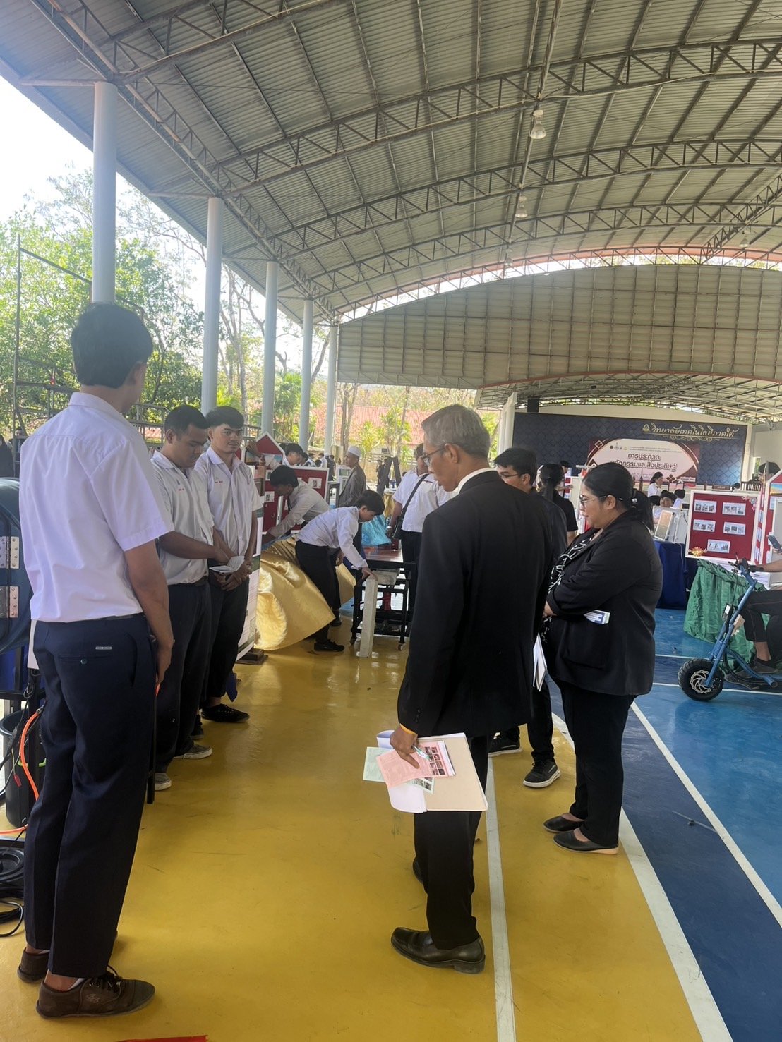 นายสมบัติ เครือสาย ผู้ช่วยผู้อำนวยการฝ่ายกิจกรรมพัฒนานักเรียน นักศึกษา วิทยาลัยเทคโนโลยีสุราษฎร์พาณิชยการ นำตัวแทนนักเรียน นักศึกษา และครูผู้ควบคุมทีม
